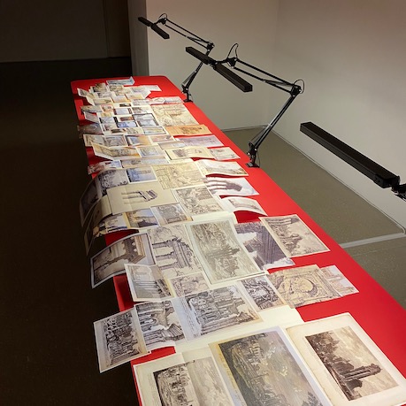 This is the second version of the film installation, ‘FOSSIL’, made for exhibition at the British Schol at Rome. The work was originally commissioned by the Royal Academy Schools and exhibited at the Royal Academy Weston Studios in 2019. There, alongside the 16mm film, the installation included a number of large early 19th century plaster casts of architectural details from the Roman Forum. For this exhibition in Rome the film is accompanied by a very large album or scrapbook. This album opens, as a series of fold-out spreads, to a width of 3m and contains a selection, around 700 in all, of the hundreds of reproduction images we have collected over the last four years as we researched the ideas central to the work: the architectural cast and its role in the education of architects; architecture in motion; the architectural souvenir; the guidebook tradition; measuring ancient architectural ruins, and the copy.