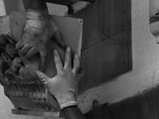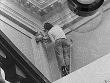 At the heart of the installation is a concern with the copy. The casts, of course, are plaster copies, but they sit at the centre of a spiral of more and more copies; a set of photographic reprints of the young German artist Blinky Palermo atop an impossibly high ladder painting the cornice in the cast gallery at Edinburgh College of Art in 1971; a painters facsimile of a water colour made for a lecture by Sir John Soane at the Royal Academy in 1801, which depicts another young man up an impossibly high ladder, this time surveying the Temple of Jupiter Stator at Rome; and the film print itself (which echoes the negative to positive relationship between mold and cast, a relationship complicated here by using an optical printer to copy the original negative as a positive, so that it can be printed to a 16mm exhibition print for projection as a negative).