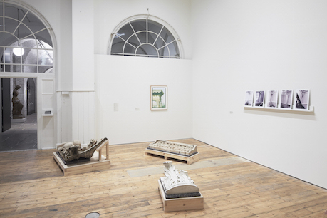 Exploiting the simple act of changing the orientation of an object, the installation also includes a number of un-refurbished early 19th century casts from the RA collection, laid on their backs and placed on felt blankets and simple wooden transportation pallets. We usually see architectural casts from a distance, elevated high up on a wall, or at the summit of a column, here the casts can be seen in close up, their weight, roughness and organic qualities emphasised by the awkwardness and vulnerability with which they seem to lie prone on the ground.