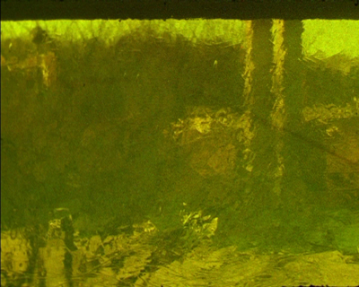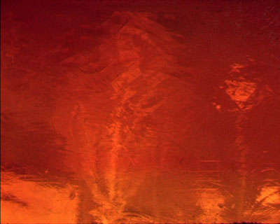 Recurring sections suggest an abstract colour field film, entirely shot through full frame blocks of stained glass. They create the illusion of looking out at a world from a contained space that might be deep underground or deep under water as if, in this context, the viewer is looking out of the subterranean space through some kind of viewing device or occluded window. These sections also produce an immersive spectacle of their own as they flood the viewing space with colour.