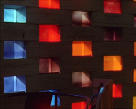 The film switches from the poetic style of the late post-war architectural documentary (the films used are Dudley Shaw Ashton’s BFI Experimental Documentary Coventry Cathedral of 1958 and The John Laing Film Unit Coventry Cathedral of 1962), to live video effects material taken from Tony Palmer’s BBC2 outside broadcast of German progressive rock band Tangerine Dream playing in Coventry Cathedral in 1976, to extended sequences of immersive expanses of abstract coloured glass that suggest a sequence from a science fiction film in which a camera sweeps around and across a vast structure or space.