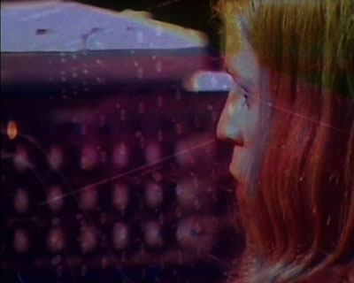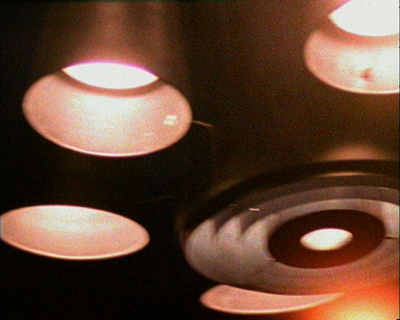 At the same time the film undercuts this spectacle by developing a formal relationship between modernist stained glass and the film strip in which the stained glass cell becomes an analogue for the film frame suggesting that the viewer has taken up a position inside a projector or an optical printer.