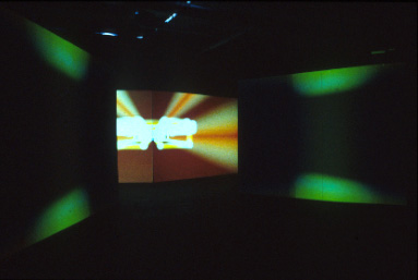 We are working to produce simple immersive environments in which the mobile spectator encounters the architectural qualities of the projected video image. By using computer generated architectural modelling programmes we are exploiting the differences and similarities between screen space and real space. The work employs these modelling programmes to create physically impossible multiple camera movements that are recreated as an image world in the gallery. The resulting installation is then experienced by the spectator as a dynamic environment of projected images that enfold and swirl around the viewer".