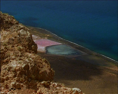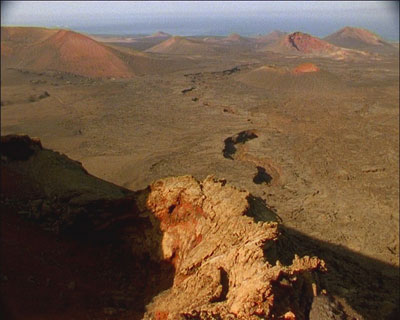 The form is significant as it plays on notions of the prospective nature of the proposal or pre-production process and the retrospective nature of the rediscovered film - that it is pre-production for a film set in the future adds to this elaboration of the placing of the work in time. This movement between past and future (and a desire to fix or arrest that movement) is echoed in the projected vision for the island of Manrique, its appearance to us now in a contemporary context, and the striking visual dynamic of the strange liquefied or shattered forms of the lava fields - now unchanging and inert.