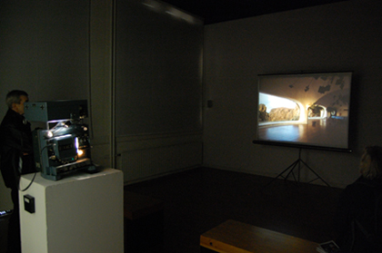 The framework that this provides is only ever implied however, never being explicitly stated, and while the actors’ camera tests allow for extracts of scripted speech and references to the themes of the work (as if from the proposed film) the images don't serve to simply illustrate this conceptual conceit. Rather the architecture and the landscape and their particular visual quality forms the larger part of the works overall impression. In this way, through the films series of ‘temps mort’ sequences, the other worldliness of the landscape and the visionary idealism of the architecture speaks of the tension inherent in a utopian will to preserve an image and control change.