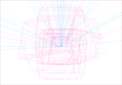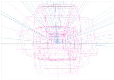 The drawings are copies, in coloured pencil on paper, of views from the 3D modelling application used to create Prism. The views, which typically would appear as windows named Front, Back, Left, Right etc., show the co-ordinates of the points-of-view from which video frames of the 3D animation are rendered. The software represents these points in space with a 3D 'camera' icon and its field of view. All thirteen cameras occupy the same point in space. They are each positioned with their centres at the co-ordinates - zero X, Y, and Z