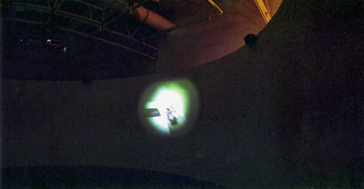 The piece takes the form of an installation occupying a blacked out space about 9-13m square. Within this a large wooden Wall of Death cyclorama (or continuous screen) has been constructed, with a circumference of around 25m, creating a circular space of approximately 7-11m in diameter. Attached to the ceiling at the centre of the cyclorama is a custom built video projector mount which holds two video projectors. These two projectors face outwards and away from each other, focused in opposite directions on the surrounding screen. The mount is driven by an electric motor and revolves at about 8 revolutions per minute. Within the space therefore are projected onto the continuous cyclorama two separate but synched video images directly opposite one another and moving at the same speed across the screen.