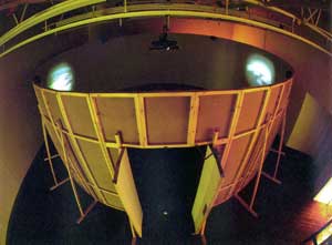 This architectural feature refers as much to early cinema history as to the thrills of dare-devil fairground spectacle. The exhibitionism of pre-Hollywood cinema and experimentation with panoramic projections from the likes of the Lumiere brothers and other early innovators forms a backdrop to this work.