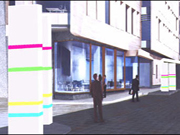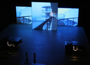 Using 3D-modelling/architectural visualisation software the work takes the form of a multi-screen immersive environment in which the mobile spectator encounters the differences and similarities between screen space and real space.