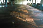 A quantity of dirt, grease and paint was removed from the floor of a large warehouse space to create the illusion of sunlight falling through the adjacent windows.